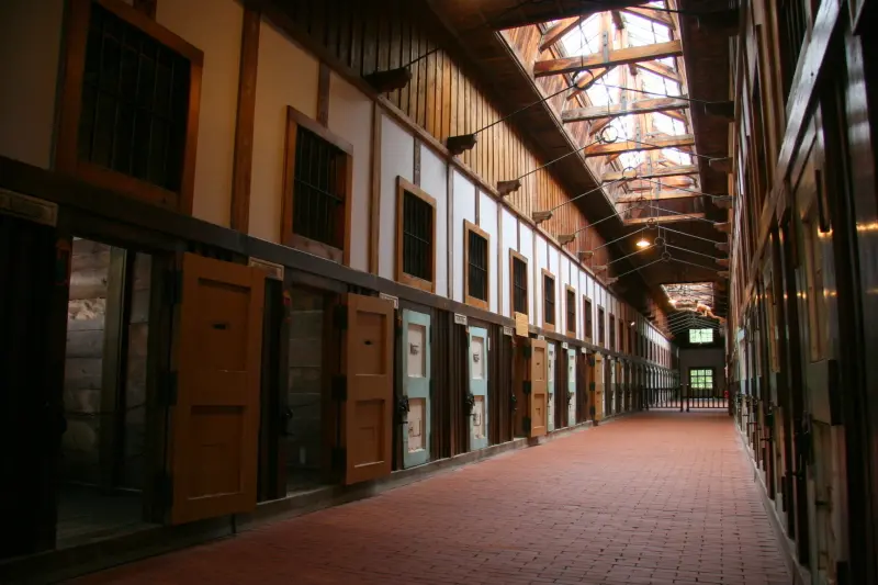 放射状舎房の中心部から放射線状に伸びる廊下構図。
