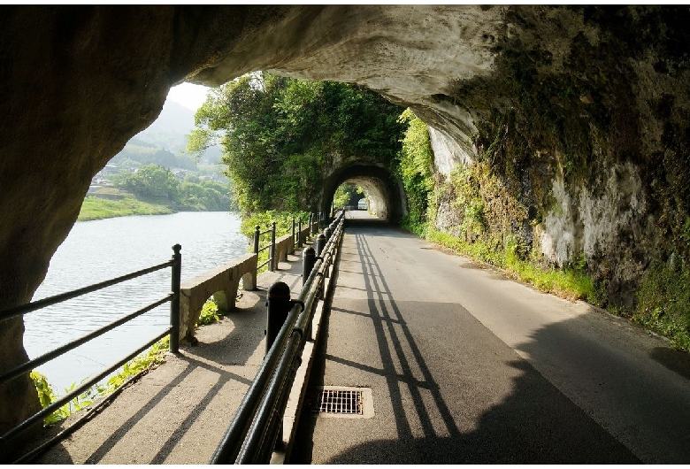 僧・禅海和尚が30年かけて掘り抜いたとされる手掘りのトンネル「青の洞門」。