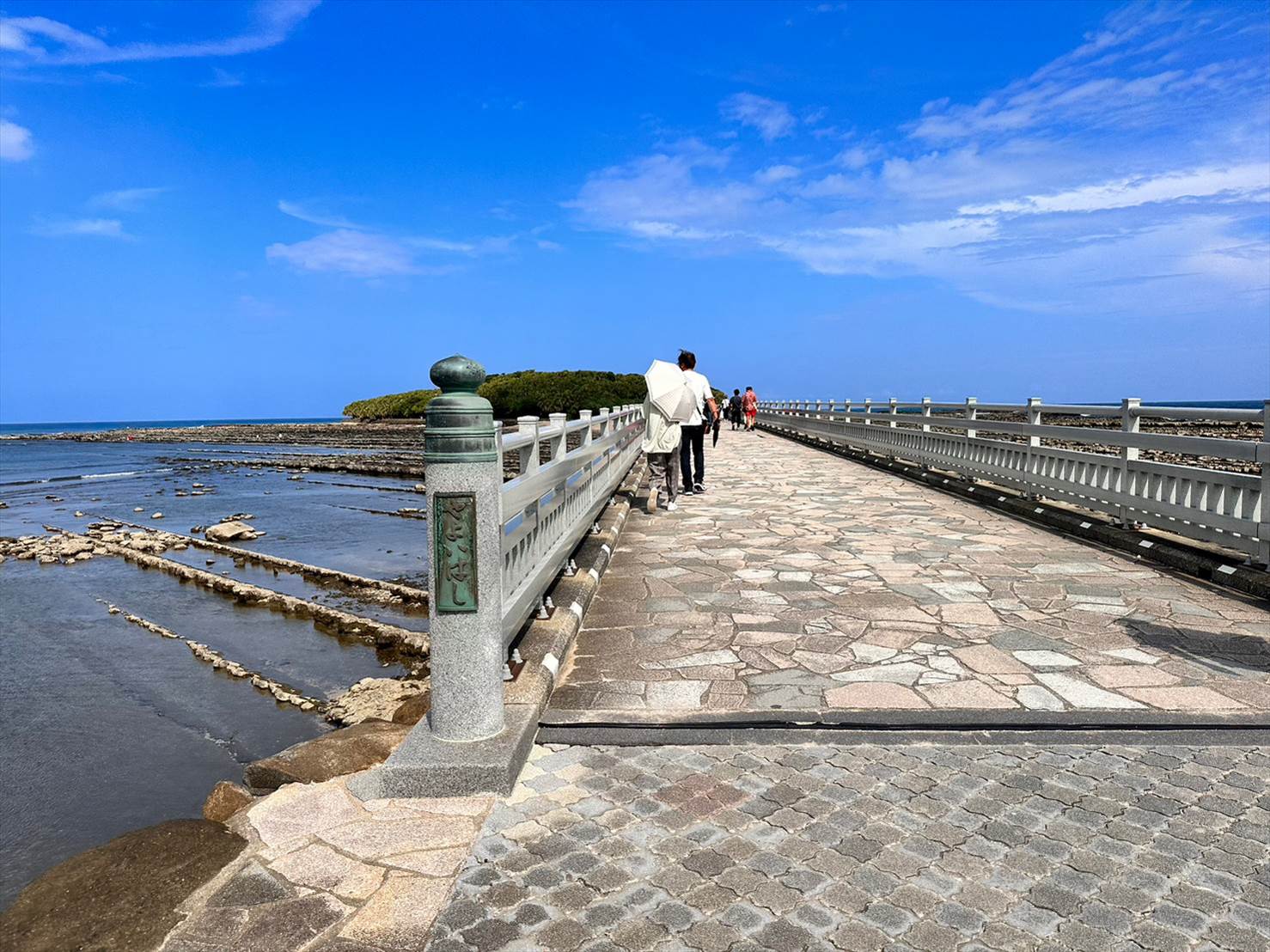 弥生橋(島へ渡る橋)を斜めから撮影し、青空+海を背景にシルエット