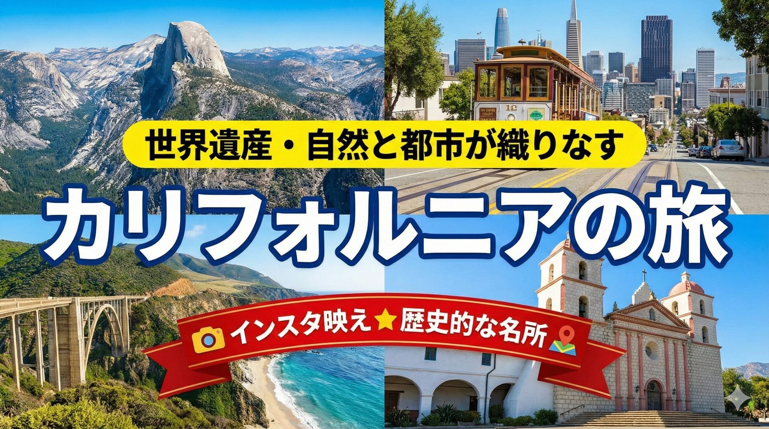 ヨセミテの壮大な断崖、レッドウッドの巨木の森、サンフランシスコの街並みと海風。
