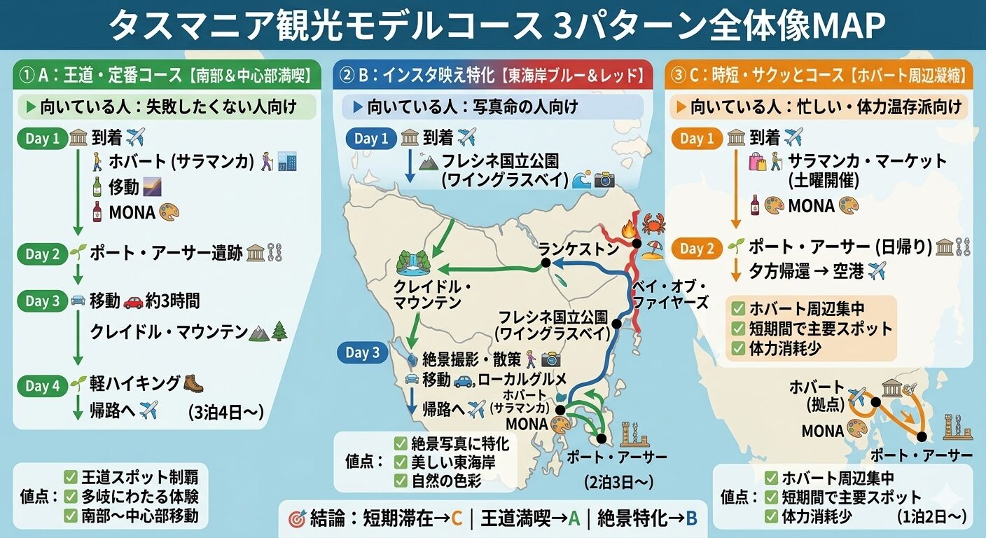 | C:時短・サクッとコース | 忙しい・体力温存派向け | 【ホバート周辺凝縮】 サラマンカ・マーケット(土曜) → MONA → ポート・アーサー(日帰り) |