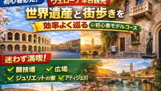 #お勧めのホテル ヴェローナ半日観光|世界遺産と街歩きを 効率よく巡る初心者モデルコース ヴェローナ半日観光|世界遺産と街歩きを効率よく巡る初心者モデルコース導入文イタリア北部に位置する ヴェローナ は、街全体が世界遺産に登録されている、ヨーロッパ屈指の街歩き都市です。ローマ時代の円形闘技場、中世の広場、美しい川沿いの景観が徒歩... 2026.01.27 #お勧めのホテル#ホテル・高級・中級・格安#世界遺産 #インスタ映え #観光ガイド #お勧めスポット#重要文化財#お勧めホテル #交通手段